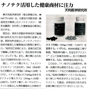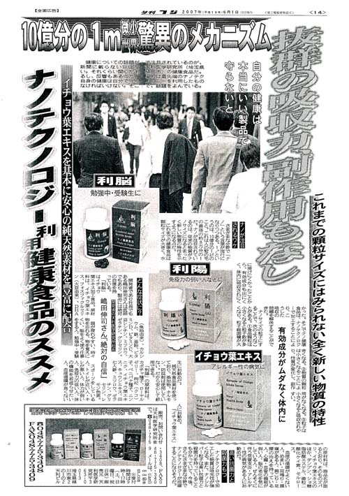 | H | 2007.6.1 | 2007年6月1日付、夕刊フジにて、 “ナノテクノロジー利用健康食品のススメ”として『利脳』『利陽』『イチョウ葉エキス』が全面広告で掲載される |