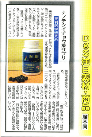 | D | 2007.2.28 | 2007年2月28日付、第657号健康産業流通新聞にて、“ナノテクイチョウ葉サプリ”として『利脳』が掲載される | ||